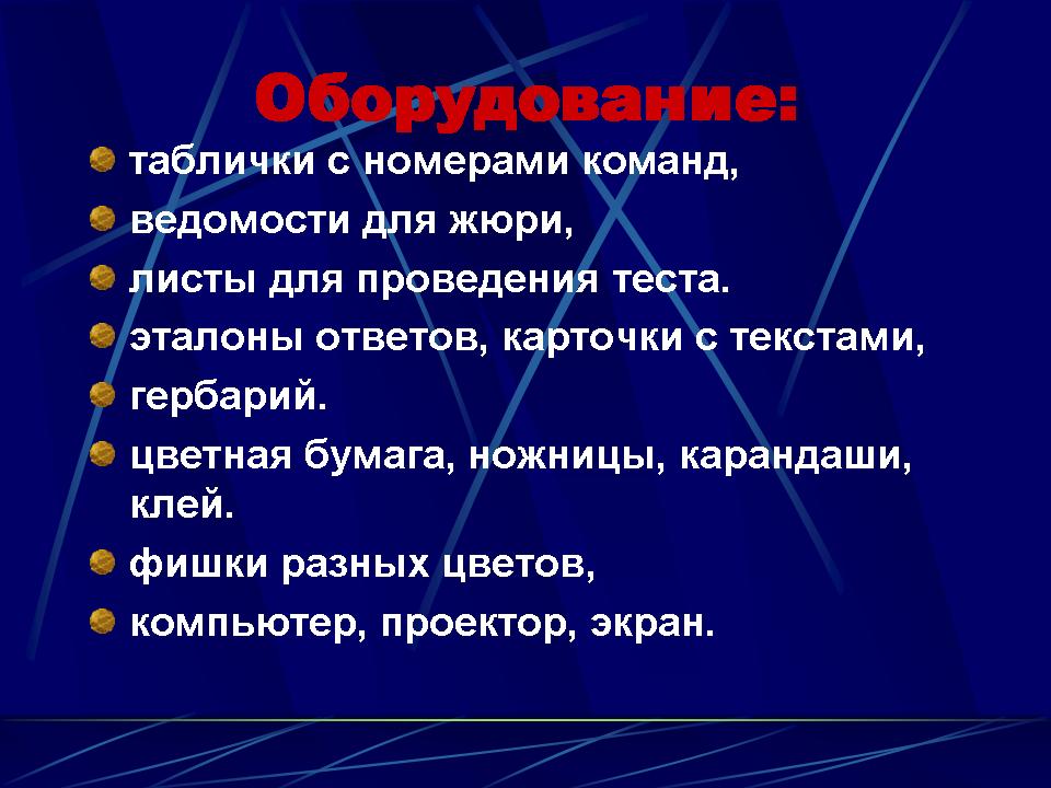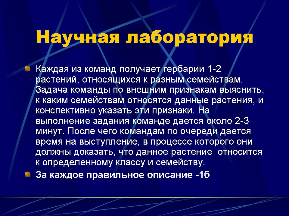 Каждая из команд получает гербарии 1-2 растений, относящихся к разным семействам. Задача команды по внешним признакам выяснить, к каким семействам относятся данные растения, и конспективно указать эти признаки. На выполнение задания команде дается около 2-3 минут. После чего командам по очереди дается время на выступление, в процессе которого они должны доказать, что данное растение относится к определенному классу и семейству.