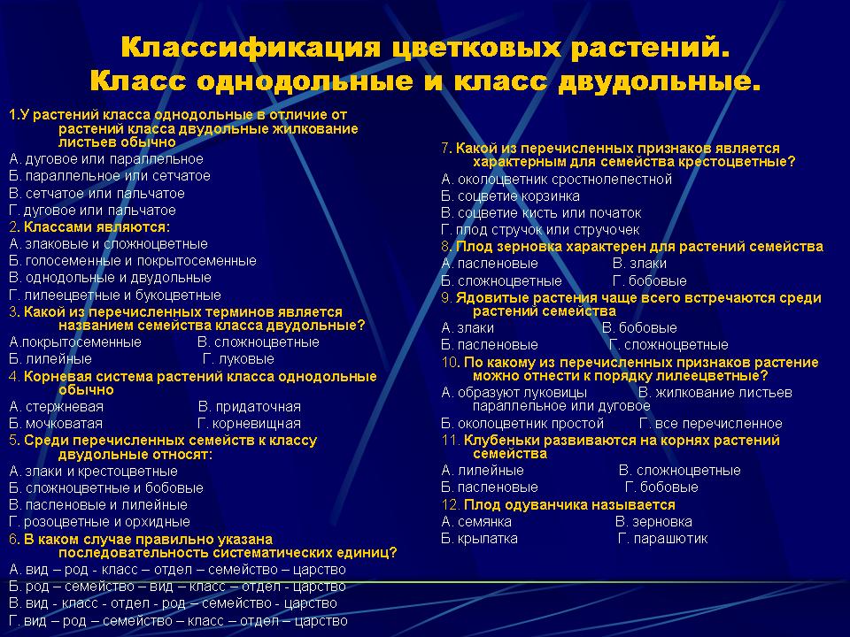 Цель: закрепить знания учащихся о многообразии цветковых растений на Земле, об отличительных признаках растений различных классов.