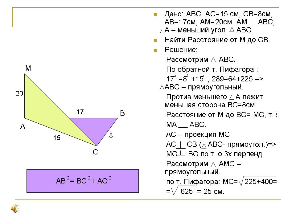 - Точка М равноудалена от всех вершин прямоугольного треугольника, катеты которого равны 6 и 8 см. Расстояние от точки М до плоскости треугольника равно 12. Найдите расстояние от точки М до вершин треугольника.