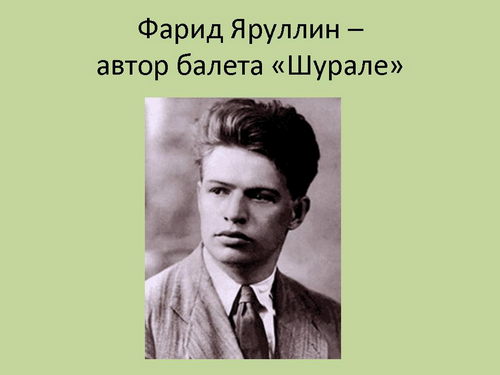 Все мы с раннего детства знакомы со стихами знаменитой поэмы Г. Тукая - "Шурале". Эта поэма вдохновила многих композиторов на создание прекрасных музыкальных произведений. Самое популярное из них - легендарный балет Фарида Яруллина. (Слайд 10)