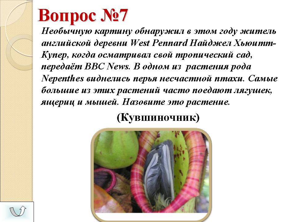 Слайд 11. Вопрос 7. Необычную картину обнаружил в этом году житель английской деревни West Pennard Найджел Хьюитт-Купер, когда осматривал свой тропический сад, передаёт BBC News. В одном из растения рода Nepenthes виднелись перья несчастной птахи. Самые большие из этих растений часто поедают лягушек, ящериц и мышей. Назовите это растение.