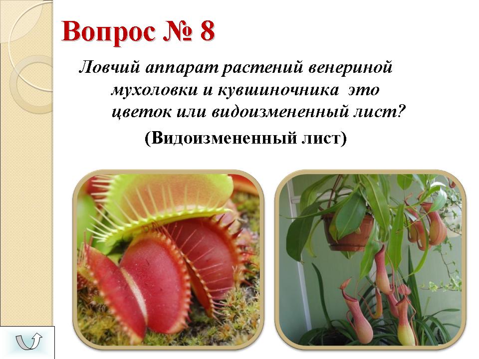 Слайд 12. Вопрос 8. Ловчий аппарат растений венериной мухоловки и кувшиночника это цветок или видоизмененный лист?