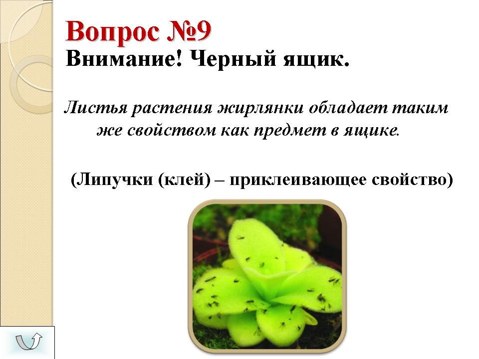 Слайд 13. Вопрос 9. Внимание! Черный ящик. Листья растения жирлянки обладает таким же свойством как предмет в ящике.