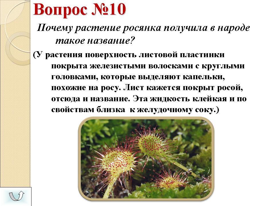 Слайд 14. Вопрос 10. Почему растение росянка получила в народе такое название? Ответ. У растения поверхность листовой пластинки покрыта железистыми волосками с круглыми головками, которые выделяют капельки, похожие на росу. Лист кажется покрыт росой, отсюда и название. Эта жидкость клейкая и по свойствам близка к желудочному соку.