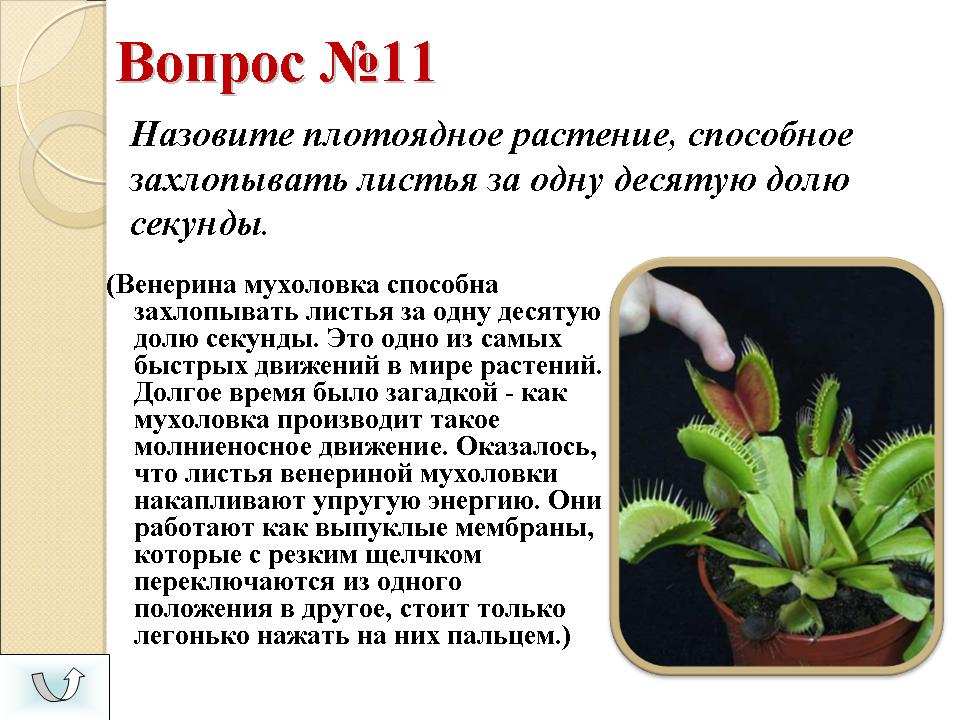 Слайд 15. Вопрос 11. Назовите плотоядное растение, способное захлопывать листья за одну десятую долю секунды.