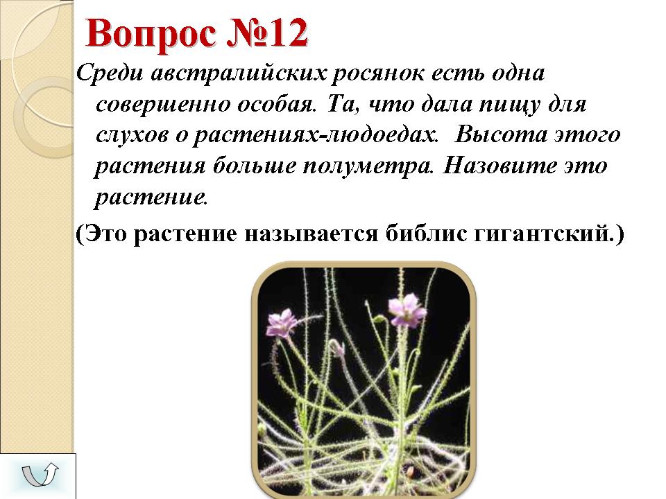 Слайд 16. Вопрос 12. Среди австралийских росянок есть одна совершенно особая. Та, что дала пищу для слухов о растениях-людоедах. Высота этого растения больше полуметра. Ответ. Это растение называется библис гигантский.