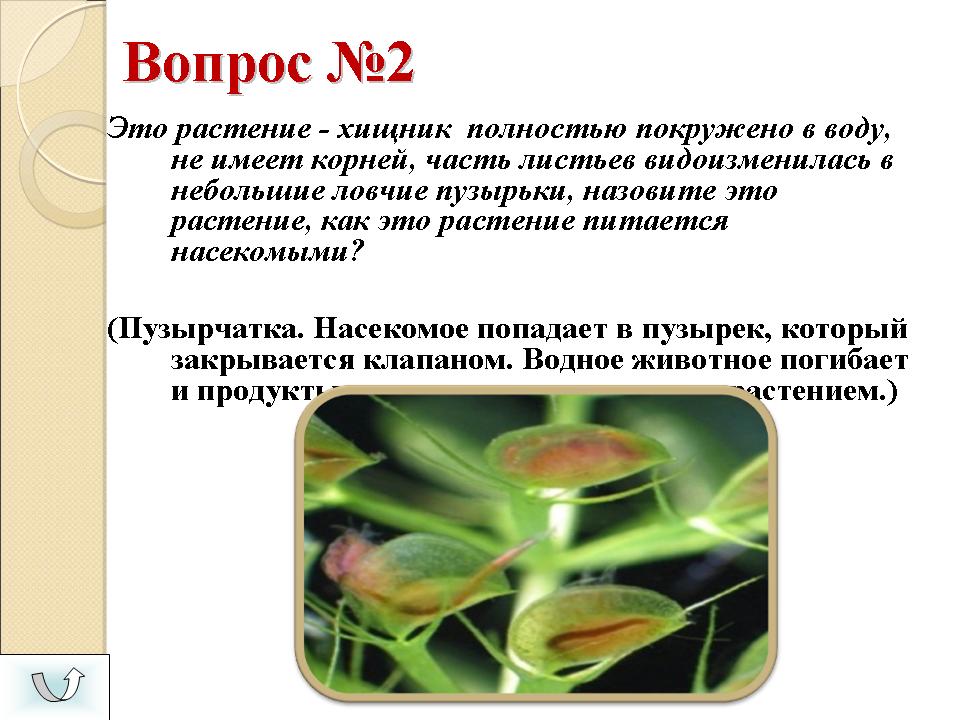 Слайд 6. Вопрос 2. Это растение - хищник полностью покружено в воду, не имеет корней, часть листьев видоизменилась в небольшие ловчие пузырьки, назовите это растение, как это растение питается насекомыми?