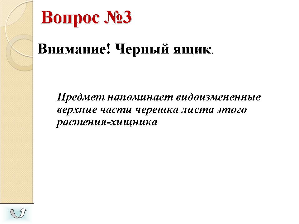 Слайд 7. Вопрос 3. Внимание! Черный ящик. Предмет напоминает видоизмененные верхние части черешка листа этого растения-хищника.