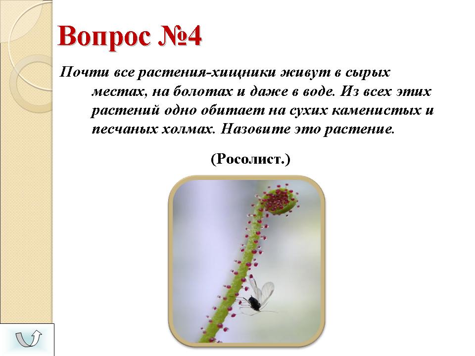 Слайд 8. Вопрос 4. Почти все растения-хищники живут в сырых местах, на болотах и даже в воде. Из всех этих растений одно обитает на сухих каменистых и песчаных холмах. Назовите это растение.