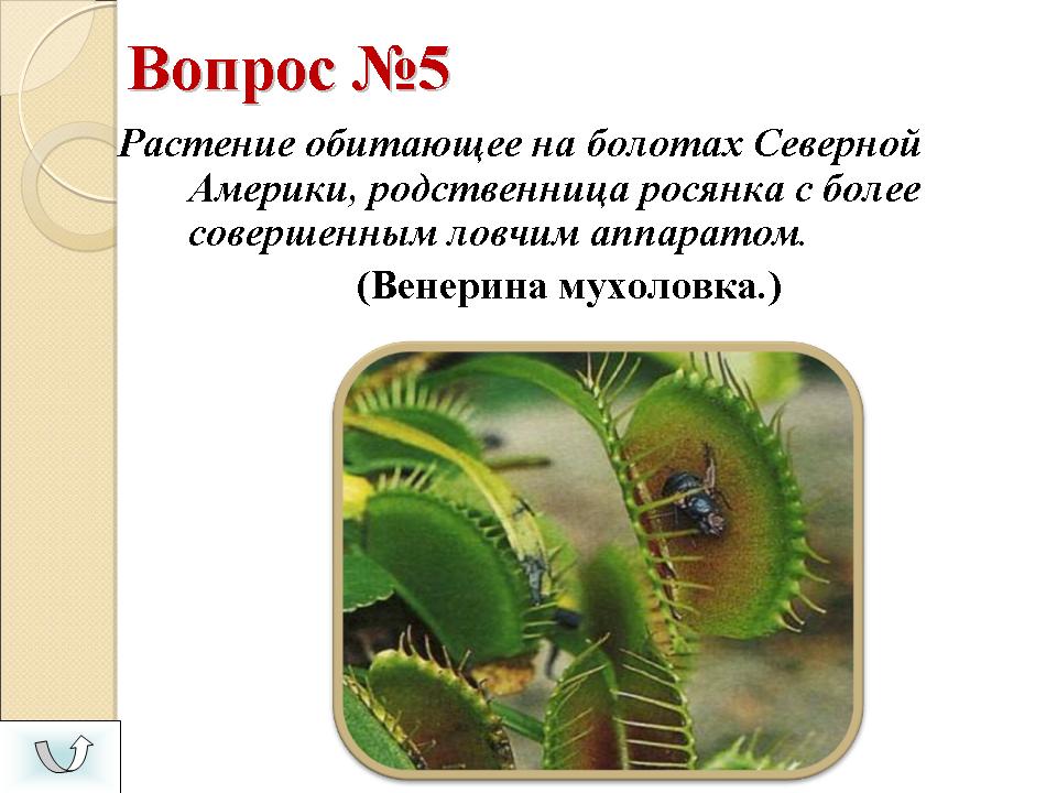 Слайд 9. Вопрос 5. Растение обитающее на болотах Северной Америки, родственница росянка с более совершенным ловчим аппаратом.