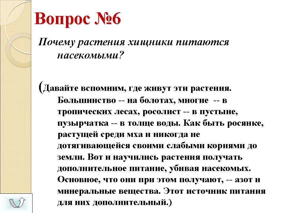Слайд 10. Вопрос 6. Почему растения хищники питаются насекомыми? Ответ. Давайте вспомним, где живут эти растения. Большинство -- на болотах, многие -- в тропических лесах, росолист -- в пустыне, пузырчатка -- в толще воды. Как быть росянке, растущей среди мха и никогда не дотягивающейся своими слабыми корнями до земли. Вот и научились растения получать дополнительное питание, убивая насекомых. Основное, что они при этом получают, - азот и минеральные вещества. Этот источник питания для них дополнительный.