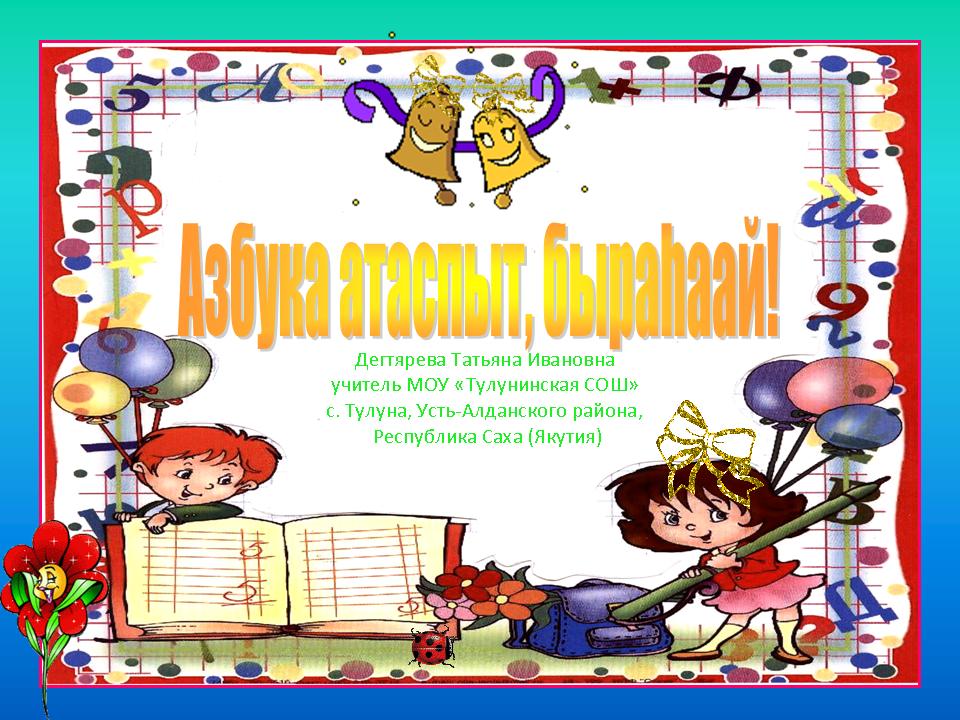 Учуутал: Дороболоруц! О5олоор, Билии дойдутугар бастакы ситиьиигитинэн – Азбуканы бутэрбиккитинэн итиитик – истицник э5эрдэлиибин! Азбука атаспыт кеметунэн буукубалары биллигит, аа5а, суруйа уерэннигит. Бугун биьиэхэ бырааьынньык уруок.