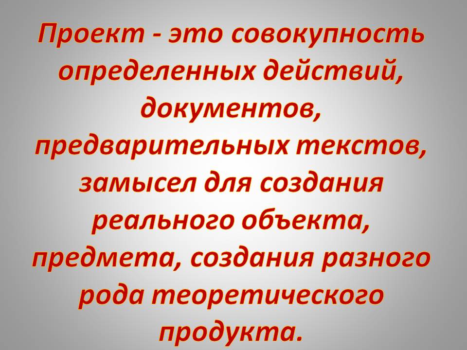 По определению проект - это совокупность определенных действий, документов, предварительных текстов, замысел для создания реального объекта, предмета, создания разного рода теоретического продукта. Это всегда творческая деятельность. (слайд 3)