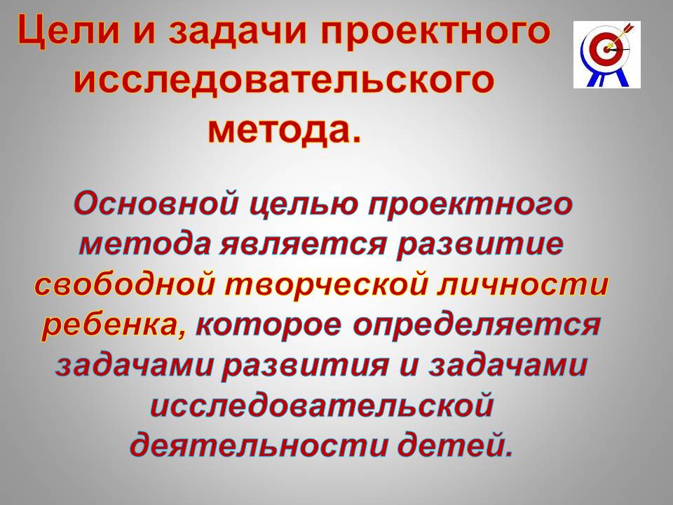 Основной целью данного метода является развитие свободной творческой личности ребенка, которое определяется задачами развития и задачами исследовательской деятельности детей.