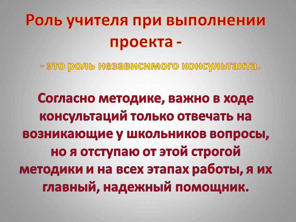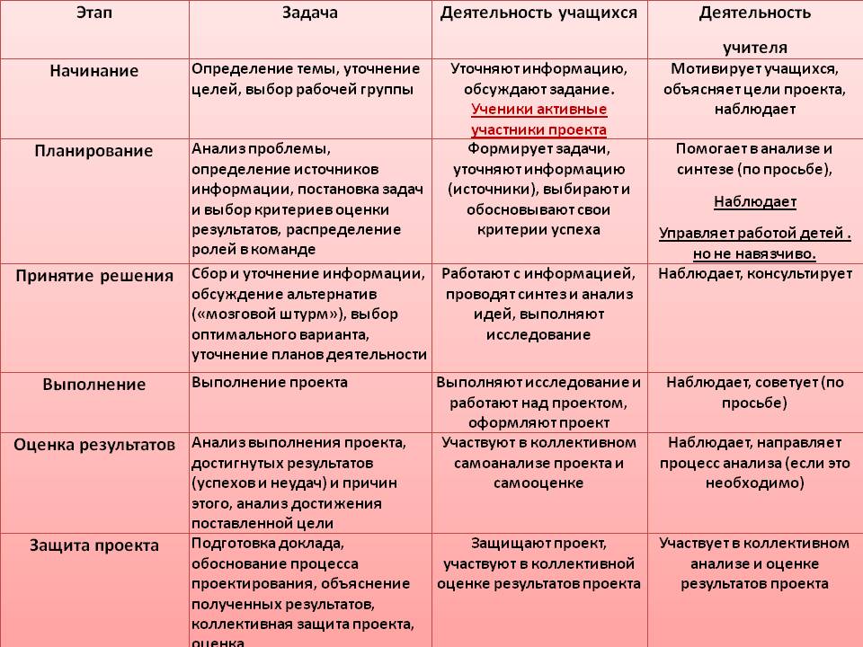При выполнении проекта качественно меняется роль учителя и ученика. Они различны на разных этапах проектирования. Это можно более наглядно увидеть в таблице №1, которая представлена в приложении 1.