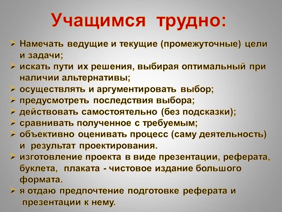 Самое сложное для учителя в ходе проектирования - это роль независимого консультанта. Трудно удержаться от подсказок, особенно если вижу, что учащиеся выполняют что-то неверно. Но важно в ходе консультаций только отвечать на возникающие у школьников вопросы, но иногда я отступаю от этой строгой методики на начальном этапе изучения физики. Почему? Да потому что учащимся трудно: (слайд 12)