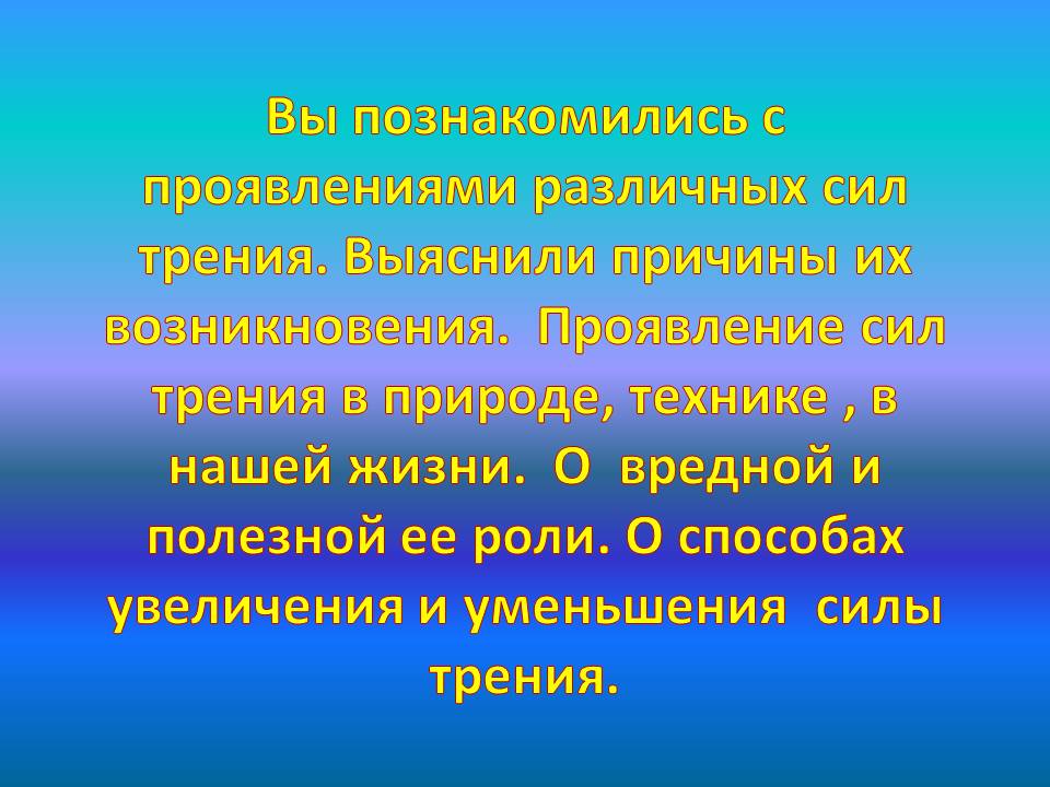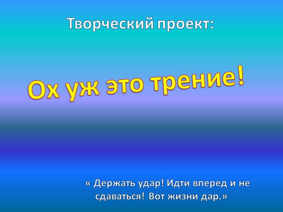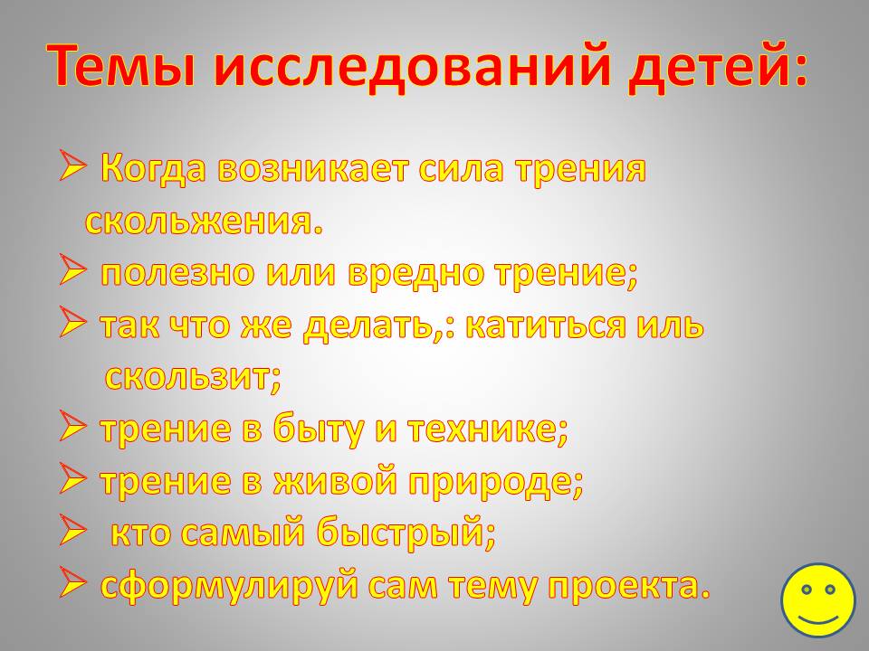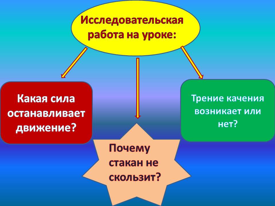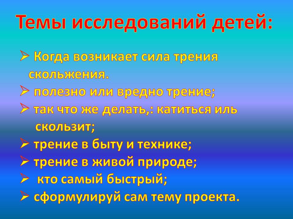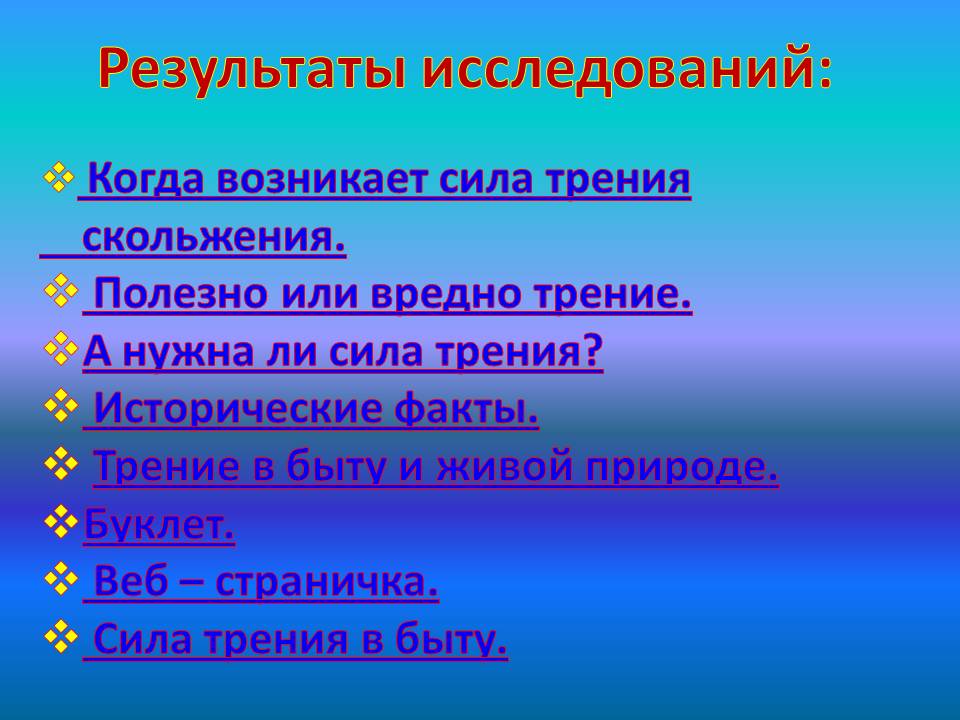 Полную методику выполнения исследовательского проекта продемонстрирую на примере: исследовательский проект - «Сила трения» седьмой класс» (приложение 3). В начале учебного года, когда редактирую календарно тематические планы, для себя отмечаю, что по теме сила трения и ее применении, приготовим исследовательский проект. За месяц до данной темы, рассказываю учащимся о таком уроке и предлагаю им темы проектов, по которым они сами выбирают форму отчета, веб – странички, буклеты, небольшие презентации, которые они должны приготовить. Ребята сами, либо с выбранными друзьями по классу, либо с родителями готовят этот отчет. Список вопросов вывешиваю в кабинете. (слайд 14) Они самостоятельно выбирают темы, формируют группы. И начинается работа к этому уроку. Консультации совмещаю с занятиями кружка «Юный информатик». Мой проект, как учителя, стоит во главе данного исследовательского проекта. Проекты с ребятами к этому уроку готовила в течении двух лет. Часть проектов была выполнена в первый год – 2004г, а следующие, учебный год – 2005, уже с другими ребятами закончили этот проект. Посмотрите, что у нас получилось. Демонстрирую проект по теме «Сила трения». (слайд 13) (презентация 3)