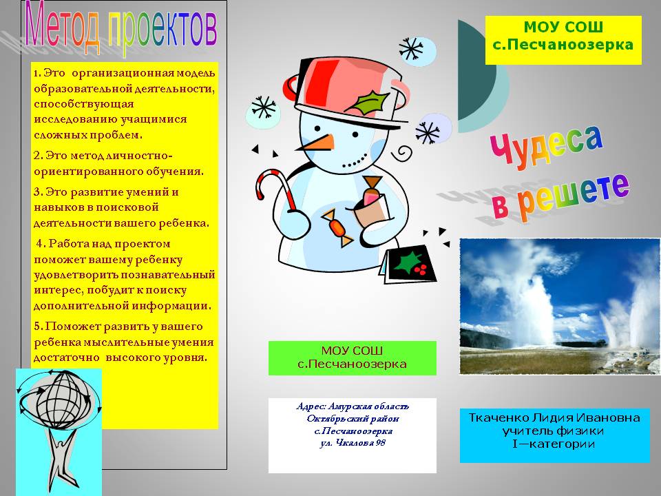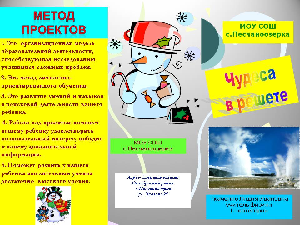 В начале учебного года, когда составляю календарно тематическое планирование, я выбираю учебную тему проекта, например “Агрегатные состояния вещества. Тепловые переходы ” – 8 класс. Проект относится к итоговым – повторительно – обобщающим, когда по результатам его выполнения оценивается освоение учащимися определенного учебного материала. Рассчитан он на два учебных часа. Первоначально создаю свой, учительский проект. Тема его звучит необычно, загадочно – «Чудеса в решете». Он краток, в нем формулирую такие вопросы: