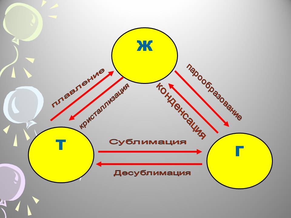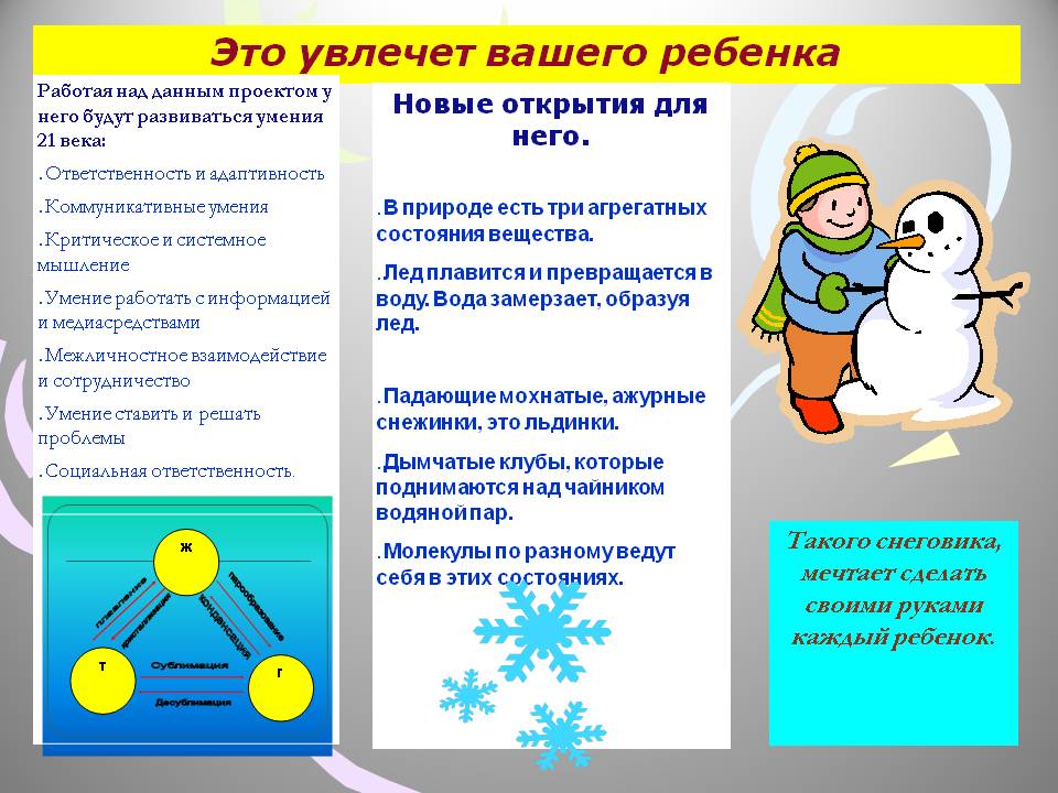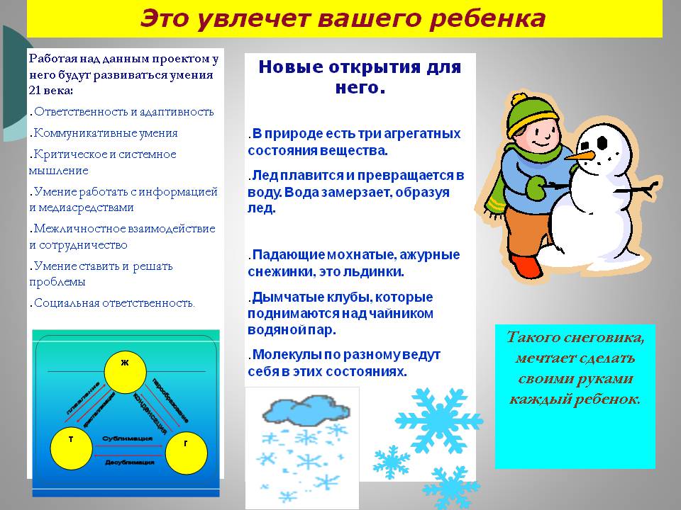 После обсуждения основополагающего и проблемного вопроса с учениками я кратко знакомлю, учащихся с различными тепловыми переходами, что тепловых переходов в природе не четыре, а шесть. Зная способности детей, умение работать с необходимыми программами, рекомендую им выбрать тему проекта. И начинаем работу, используя ранее созданную мной презентацию учителя. На консультациях рисуем слайды на бумаге. Обсуждаем их, красиво или некрасиво, какие цвета выбрать, как расположить их на слайде. Какую анимацию применить. Идет отбор материала. Выделение главных мыслей и содержания, которое кратко необходимо выложить на слайд. Для этого демонстрирую презентации, взятые с компакт диска Intel® «Обучение для будущего». (презентация 2)