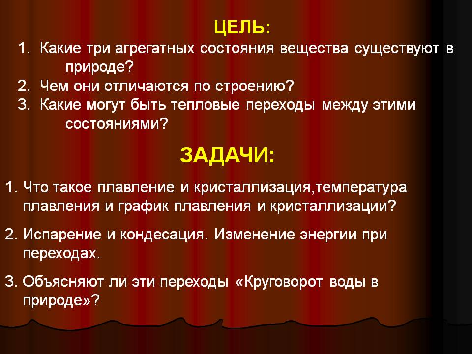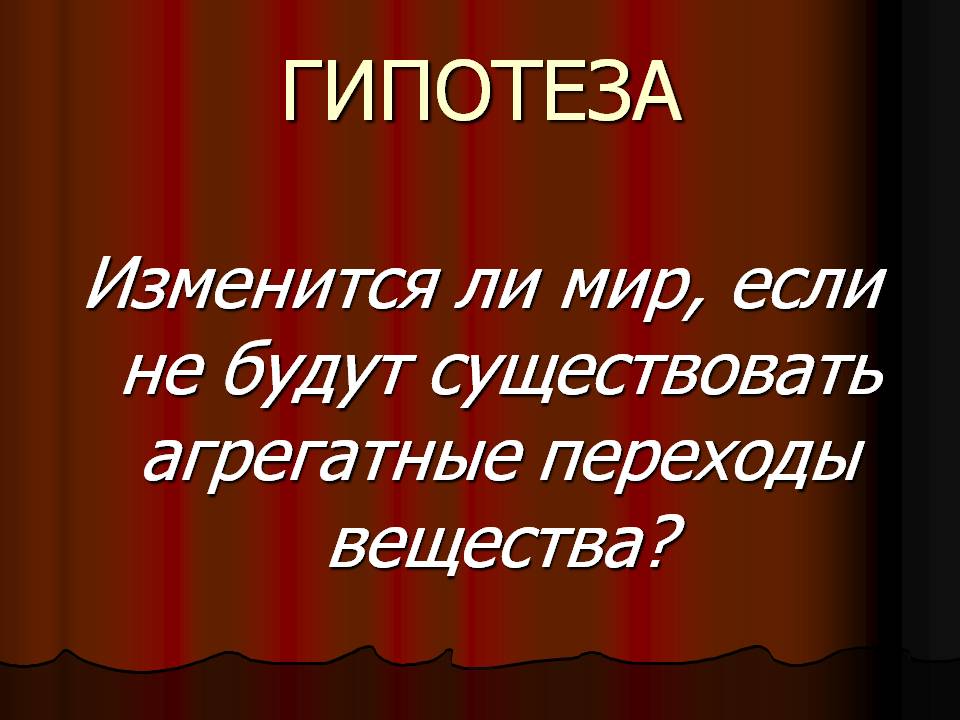 - Проблемные или вопросы учебной темы - задаваемые в рамках одной дисциплины, помогают исследовать различные стороны одного основополагающего вопроса – «Изменится ли мир, если не будут существовать агрегатные переходы вещества?»