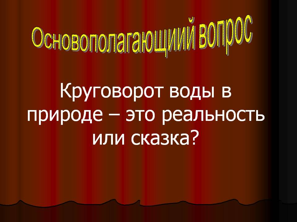 - Основополагающие вопросы - самые абстрактные в цепи вопросов и служат всеобъемлющей структурой для нескольких разделов – «Круговорот воды в природе – это реальность или сказка?»