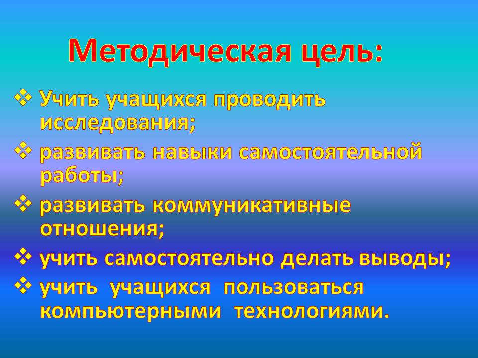 Все эти умения и навыки исследовательской деятельности я формирую, используя метод проектов, где отрабатывается методика исследовательской деятельности. Что бы сформулировать цели и задачи выбрать главное из большого объема информации, систематизировать и конкретизировать, всему этому учу ребят на консультациях при подготовке и выполнении проектов. (слайд 2)