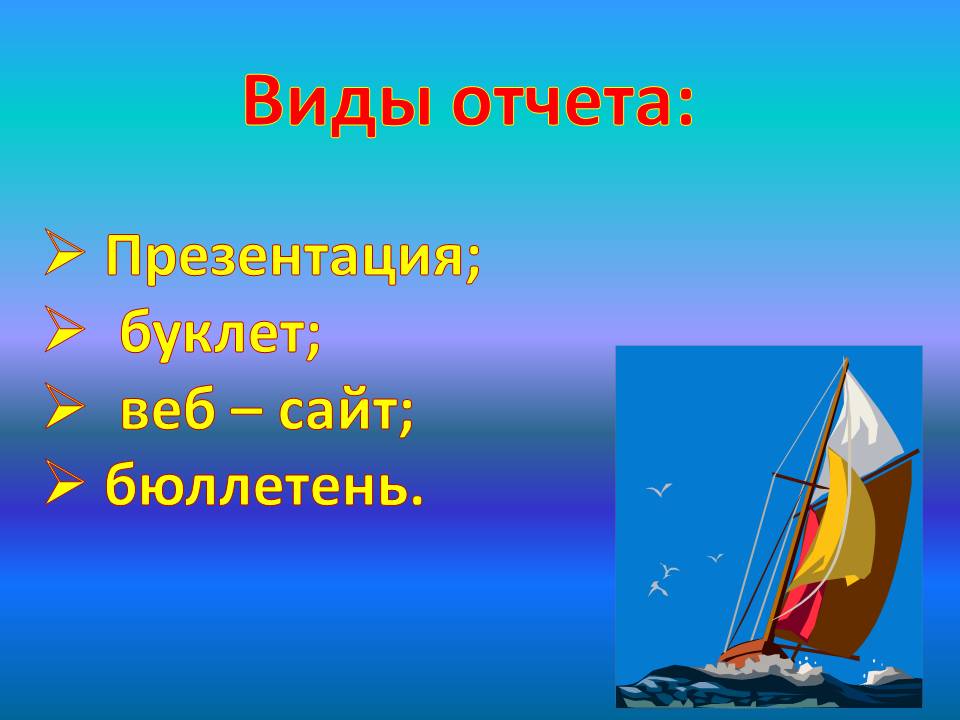 Я, в своей работе, отдаю предпочтение подготовке реферата, буклета, презентации, очень редко – веб - странички.
