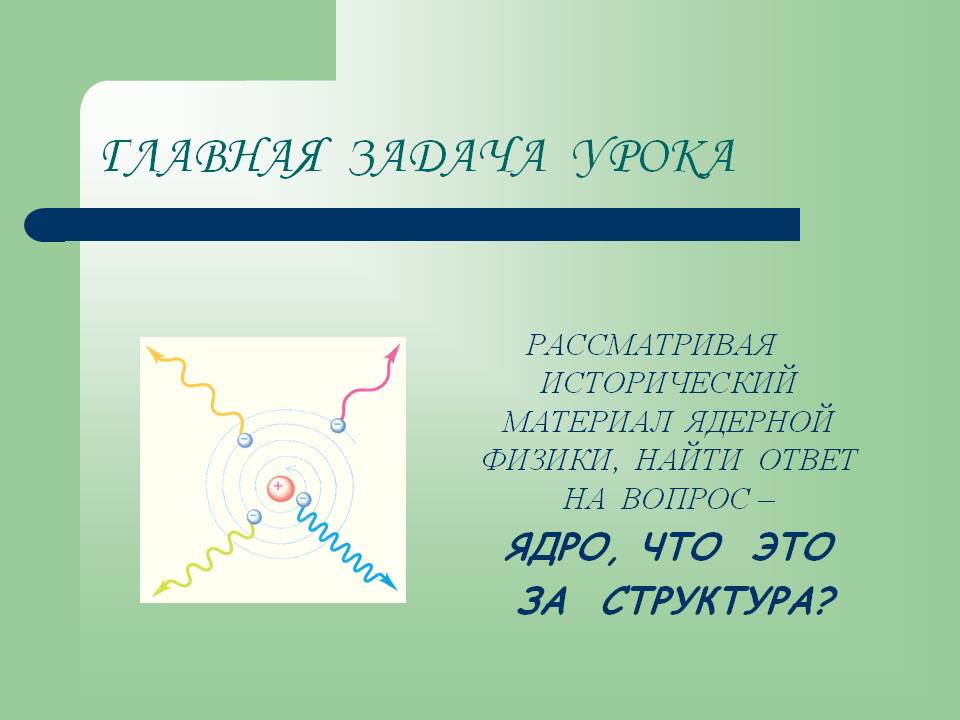Главная задача урока: рассматривая исторический материал по ядерной физике, найти ответ на вопрос – ядро, что это за структура.