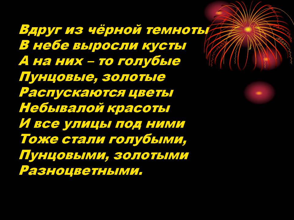 - Посмотрите на изображения салюта и послушайте стихотворение, которое прочтёт (ученик/ученица):