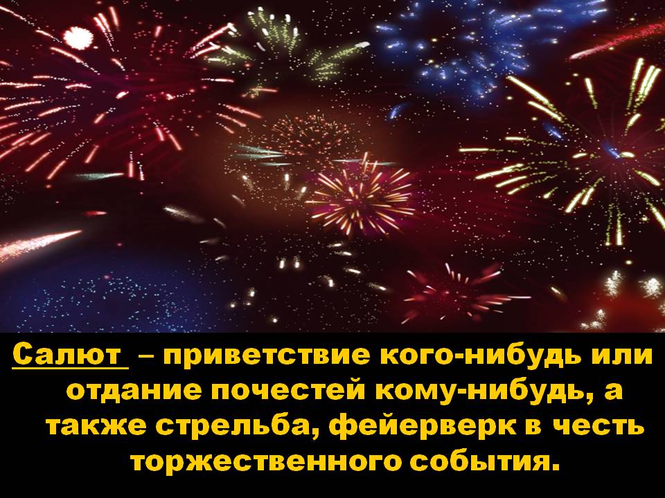 - Салют – приветствие кого-нибудь или отдание почестей кому-нибудь, а также стрельба, фейерверк в честь торжественного события.