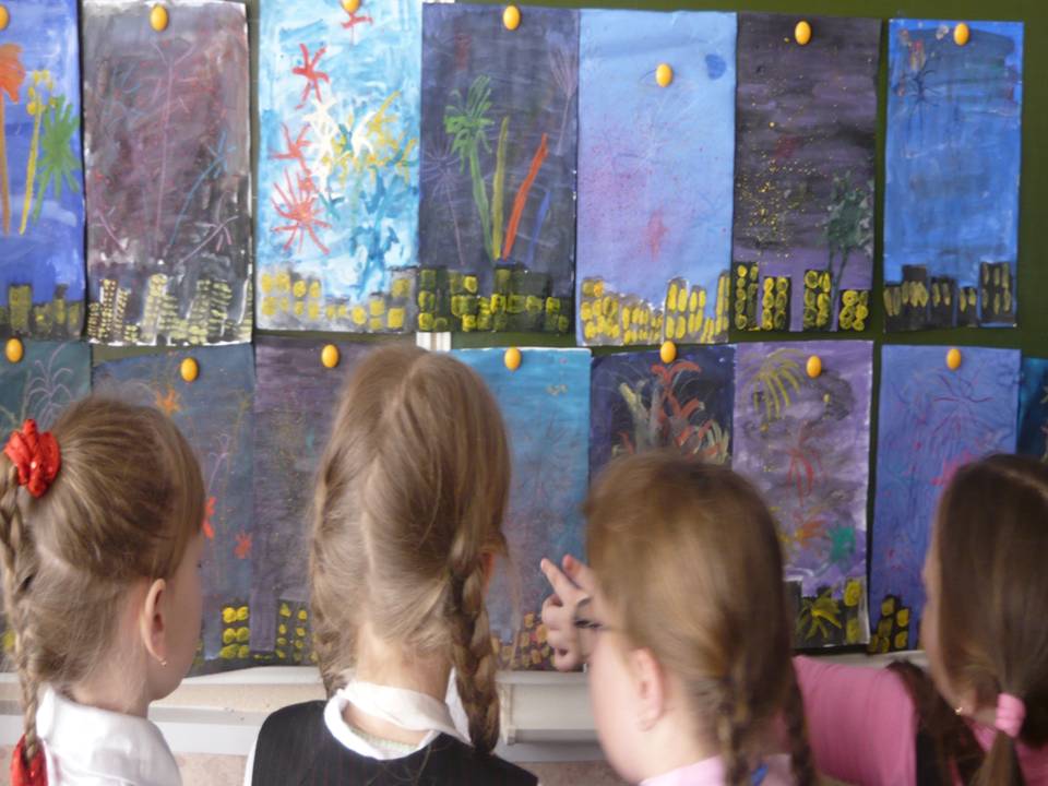 - Молодцы, ребята! Хорошо отвечали, внимательно слушали, творчески работали на уроке. Красивые, разноцветные получились у вас праздничные Салюты!