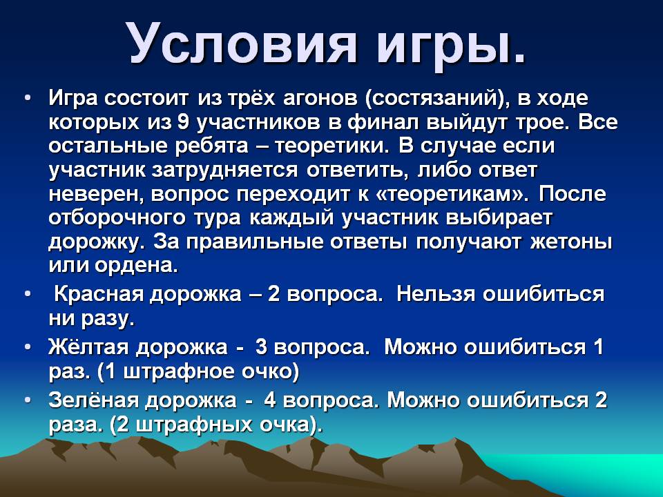 Игра состоит из трёх агонов (состязаний), в ходе которых из 9 участников в финал выйдут трое. Все остальные ребята – теоретики. В случае если участник затрудняется ответить, либо ответ неверен, вопрос переходит к «теоретикам». После отборочного тура каждый участник выбирает дорожку. За правильные ответы получают жетоны или ордена в форме буквы « У»