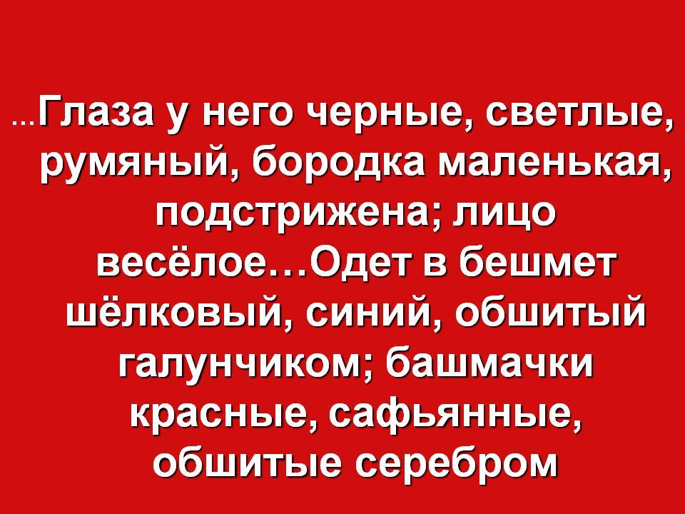 Красная дорожка. …Глаза у него черные, светлые, румяный, бородка маленькая, подстрижена; лицо весёлое…Одет в бешмет шёлковый, синий, обшитый галунчиком; башмачки красные, сафьянные, обшитые серебром (чёрный татарин Абдул-Мурат, отец Дины).