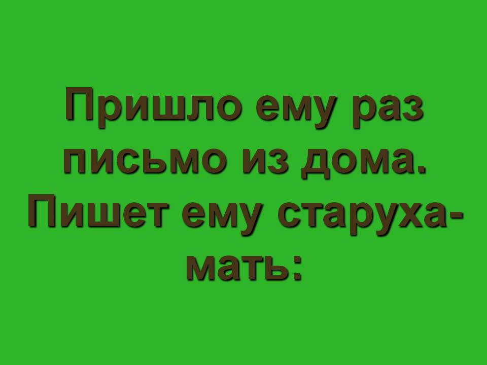 Зелёная: «Пришло ему раз письмо из дома. (Пишет ему старуха-мать: «Стара я уж стала, и хочется перед смертью повидать любимого сынка. Приезжай со мной проститься, похорони, а там и с Богом поезжай опять на службу. А я тебе и невесту приискала: и умная, и хорошая, и именье есть. Полюбится тебе, может, и женишься и совсем останешься»).
