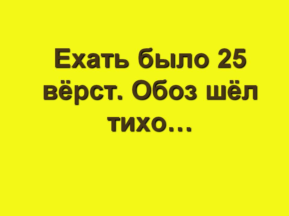 Жёлтая: «Ехать было 25 вёрст. Обоз шёл тихо…(то солдаты остановятся, то в обозе колесо у кого соскочит или лошадь станет, и все стоят- дожидаются. Солнце уже и за полдни перешло, а обоз только половину дороги прошёл. Пыль жара, солнце так и печёт, и укрыться негде. Голая степь; ни деревца, ни кустика по дороге.)»