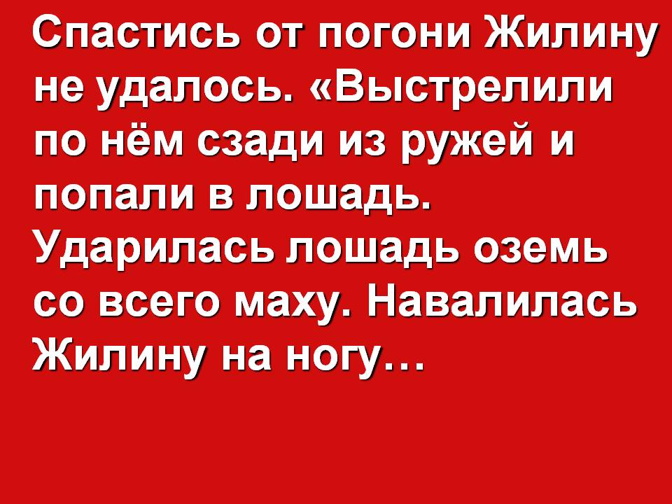Красная: Спастись от погони Жилину не удалось. «Выстрелили по нём сзади из ружей и попали в лошадь. Ударилась лошадь оземь со всего маху. Навалилась Жилину на ногу…(Хотел он подняться, а уж на нём два татарина вонючие сидят, крутят ему назад руки. Рванулся он, скинул с себя татар, да ещё соскакали с коней трое на него, начали прикладами бить по голове. Помутилось у него в глазах, и зашатался. Схватили его татары, сняли с сёдел подпруги запасные, закрутили ему руки за спину, завязали татарским узлом, поволокли к седлу. Шапку с него сбили, сапоги стащили, всё обшарили – деньги, часы вынули. Платье всё изорвали. Оглянулся Жилин на свою лошадь. Она, сердечная, как упала на бок, так и лежит, только бьётся ногами- до земли не достаёт; в голове дыра, а из дыры так и свищет кровь чёрная, на аршин кругом пыль смочила.)»