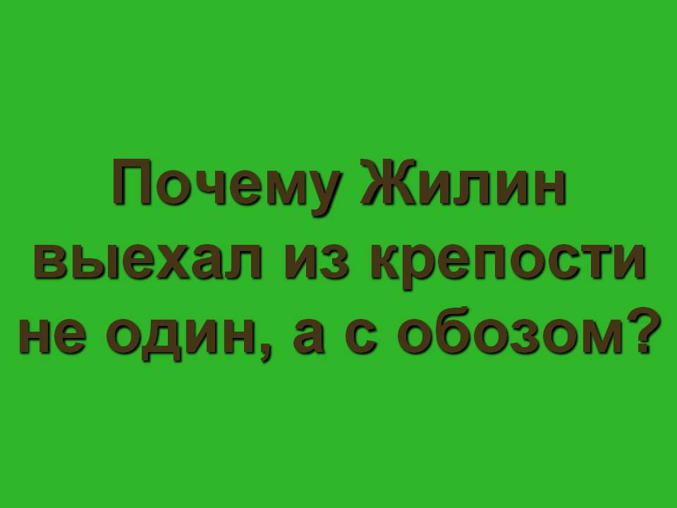 Зелёная: Почему Жилин выехал из крепости не один, а с обозом? («На Кавказе тогда война была. По дорогам ни днём, ни ночью не было проезда. Чуть кто из русских отъедет или отойдёт от крепости, татары или убьют, или уведут в горы. И было заведено, что два раза в неделю из крепости в крепость ходили провожатые солдаты. Спереди и сзади идут солдаты, а в середине едет народ.»)