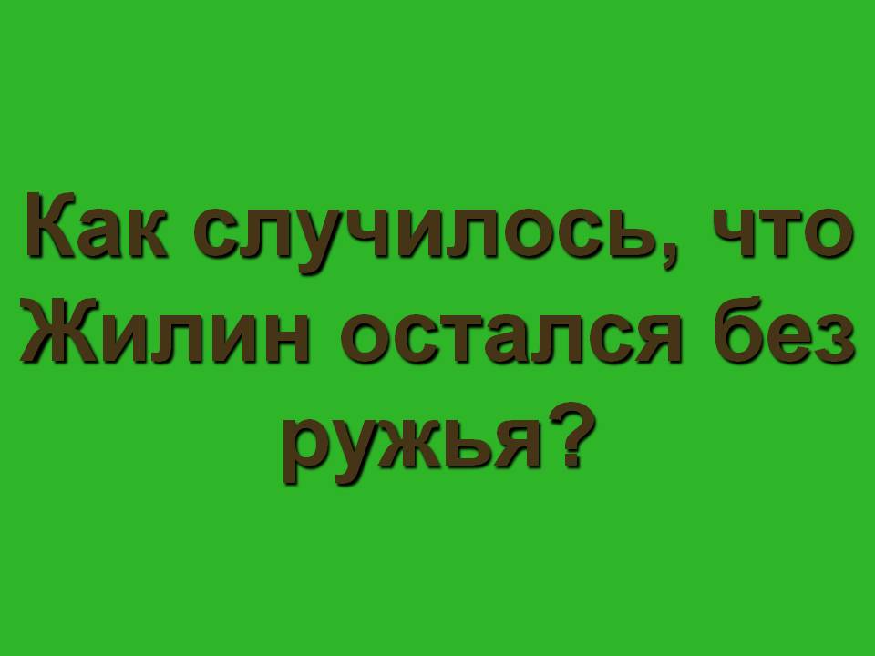 Зелёная. Как случилось, что Жилин остался без ружья? (Когда Жилин выехал на гору посмотреть, нет ли татар, он буквально столкнулся с ними. Их было человек 30. Жилин «увидал, стал назад поворачивать; а татары его увидали. Пустились к нему, сами на скаку выхватывают ружья из чехлов. Припустил Жилин под круч вовсе лошадиные ноги, кричит Костылину: