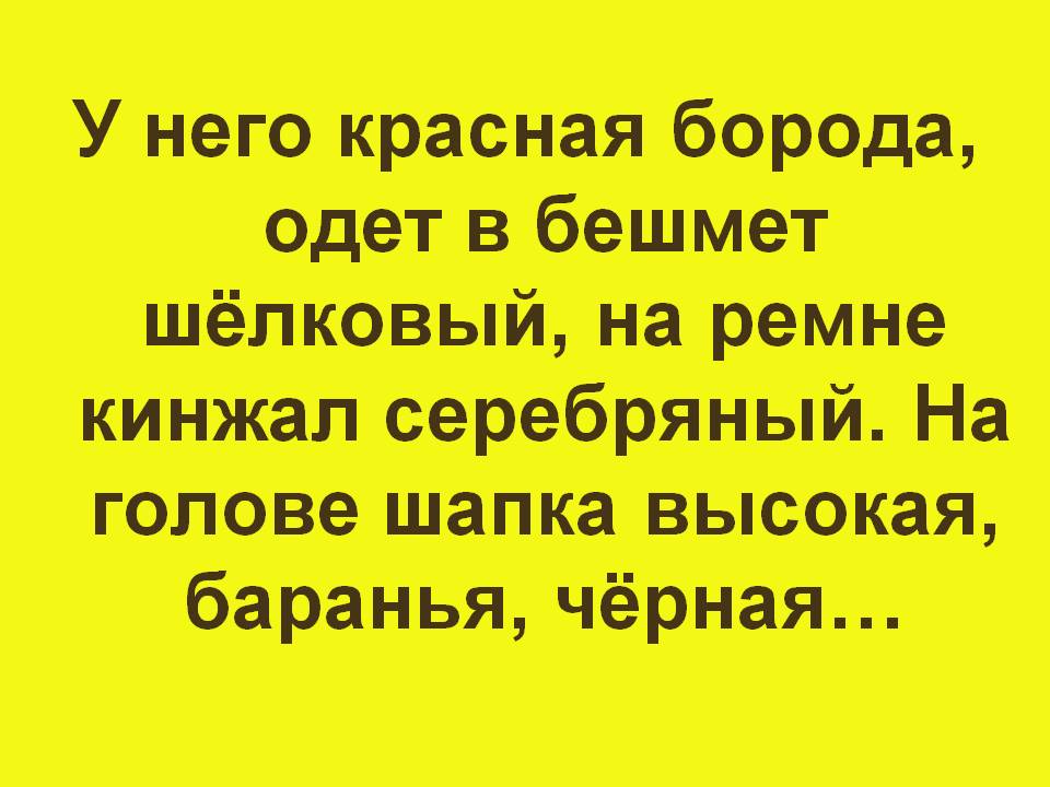 Жёлтая дорожка. У него красная борода, одет в бешмет шёлковый, на ремне кинжал серебряный. На голове шапка высокая, баранья, чёрная…(красный татарин Кази-Мугамед).