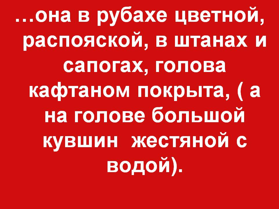 Красная дорожка. …она в рубахе цветной, распояской, в штанах и сапогах, голова кафтаном покрыта, ( а на голове большой кувшин жестяной с водой). (Молодая татарка).