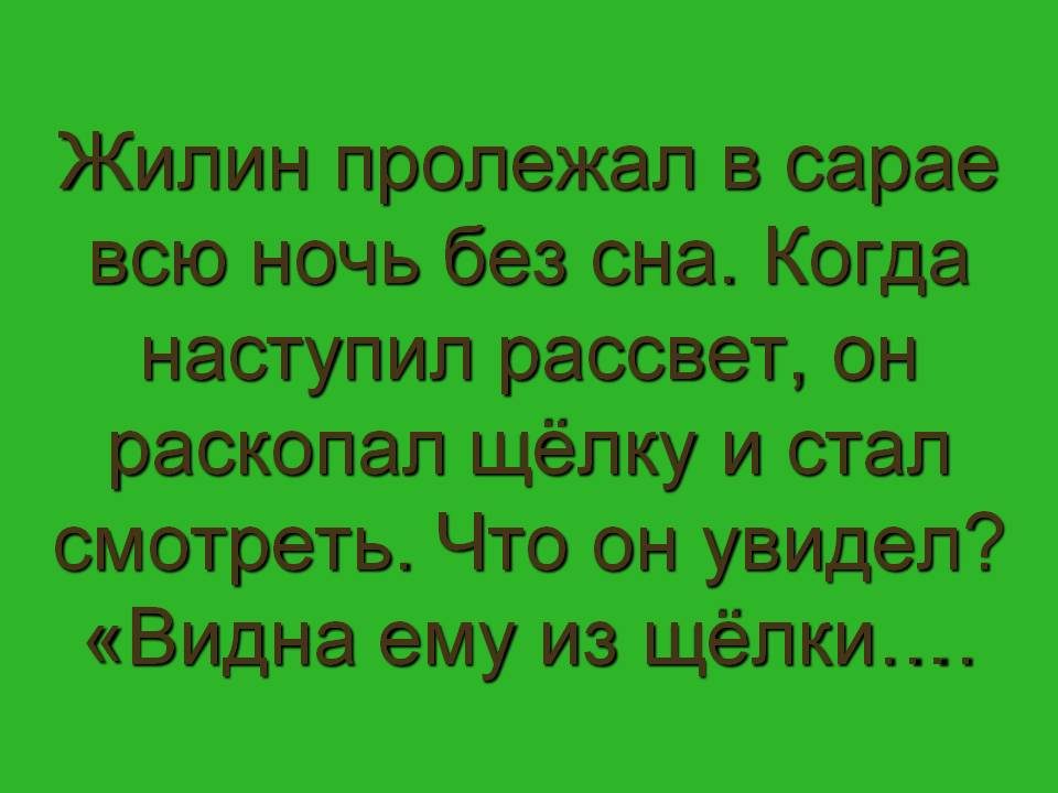 Зелёная. Жилин пролежал в сарае всю ночь без сна. Когда наступил рассвет, он раскопал щёлку и стал смотреть. Что он увидел? («Видна ему из щёлки дорога – под гору идёт, направо сакля татарская, два дерева подле ней. Собака чёрная лежит на пороге, коза с козлятами ходит – хвостиками подёргивают. Видит - из-под горы идёт татарка молоденькая, в рубахе цветной, распояской, в штанах и сапогах, голова кафтаном покрыта, а на голове большой кувшин жестяной с водой. Идёт, в спине подрагивает, перегибается, а за руку татарчонка ведёт бритого, в одной рубашонке.»)