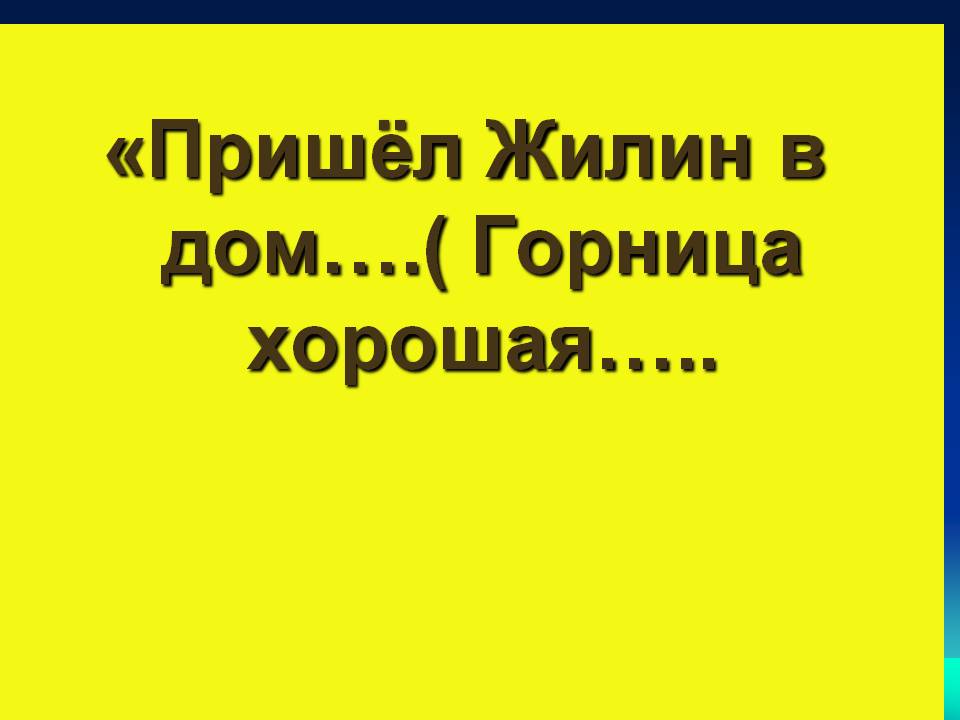 Жёлтая. «Пришёл Жилин в дом… (Горница хорошая, стены глиной гладко вымазаны. В передней стене пуховики пёстрые уложены, по бокам висят ковры дорогие; на коврах ружья, пистолеты, шашки – всё в серебре. В одной стене печка маленькая вровень с полом. Пол земляной, чистый, как ток, и весь передний угол устлан войлоками; на войлоках ковры, а на коврах пуховые подушки. И на коврах в одних башмаках сидят татары…)