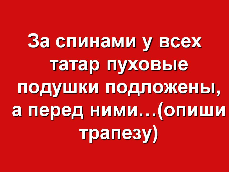 Красная. За спинами у всех татар пуховые подушки подложены, а перед ними…(опиши трапезу) «на круглой дощечке блины просяные, и масло коровье распущено в чашке, и пиво татарское – буза, в кувшинчике. Едят руками, а руки все в масле. …. Поели татары блины, пришла татарка… унесла масло, блины, подала лоханку хорошую и кувшин с узким носком. Стали мыть руки татары, потом сложили руки, сели на коленки, подули во все стороны и молитвы прочли.»)