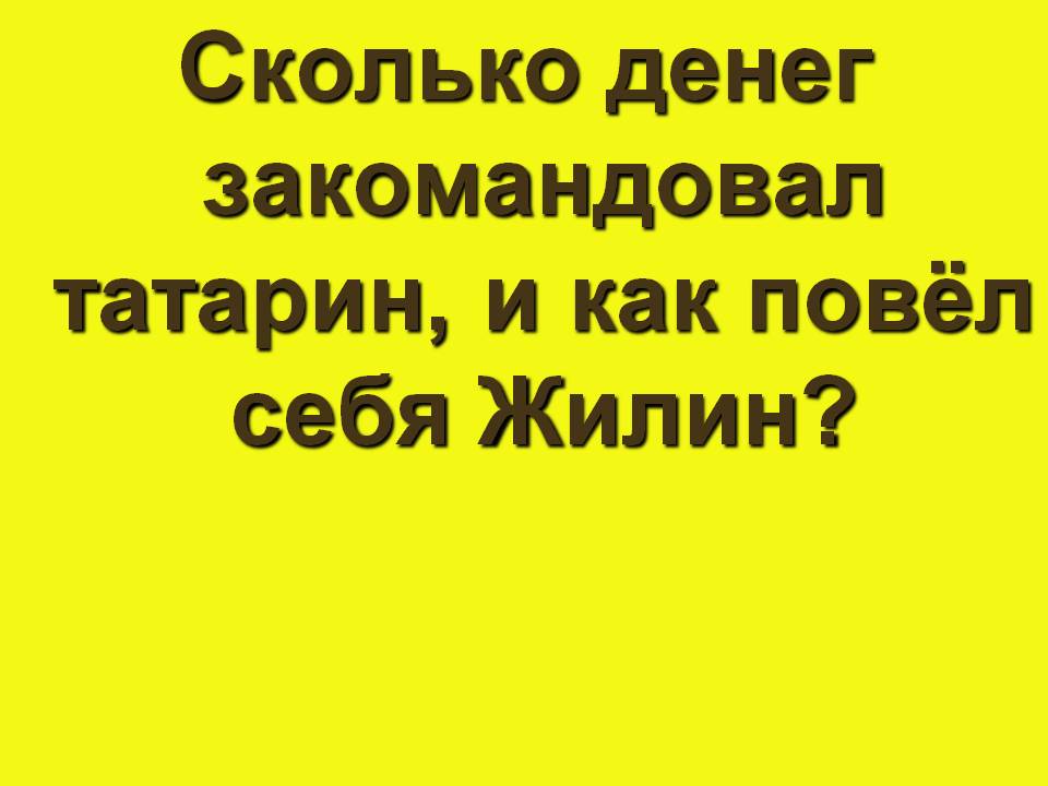 Жёлтая. Сколько денег закомандовал татарин, и как повёл себя Жилин? (Жилин подумал и говорит: «А много ли он хочет выкупа?» Поговорили татары; переводчик и говорит: «Три тысячи монет». «Нет, - говорит Жилин, - я этого заплатить не могу». Вскочил Абдул, начал руками махать, что-то говорит Жилину,- всё думает, что он поймёт. Перевёл переводчик, говорит: «Сколько же ты дашь?» Жилин подумал и говорит: «Пятьсот рублей». Тут татары заговорили часто, все вдруг. Переводчик говорит: «Хозяину выкупа мало 500рублей. Он сам за тебя 200 заплатил. Ему Кази-Мугамед был должен. Он тебя за долг взял. Не напишешь письмо - в яму посадят, наказывать будут плетью. «Эх,- думает Жилин, - с ними что робеть, то хуже». Вскочил на ноги и говорит: «А ты ему, собаке, скажи, что если он меня пугать хочет, так ни копейки ж не дам, да и писать не стану. Не боялся, да и не буду бояться вас, собак. Пересказал переводчик, опять заговорили все вдруг. Вскочил чёрный и говорит: «Урус джигит, джигит урус, что значит, «молодец». И сам смеётся. «Тысячу рублей дай.» Жилин стал на своём: «Больше пятисот рублей не дам. А убьёте - ничего не возьмёте.)