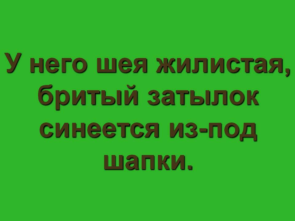 Зелёная. … У него шея жилистая, бритый затылок синеется из-под шапки. (Татарин, который вёз на лошади пленённого Жилина).