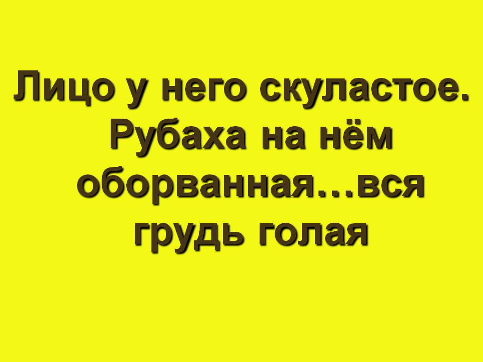 Жёлтая. Лицо у него скуластое. Рубаха на нём оборванная…вся грудь голая (работник ногаец).