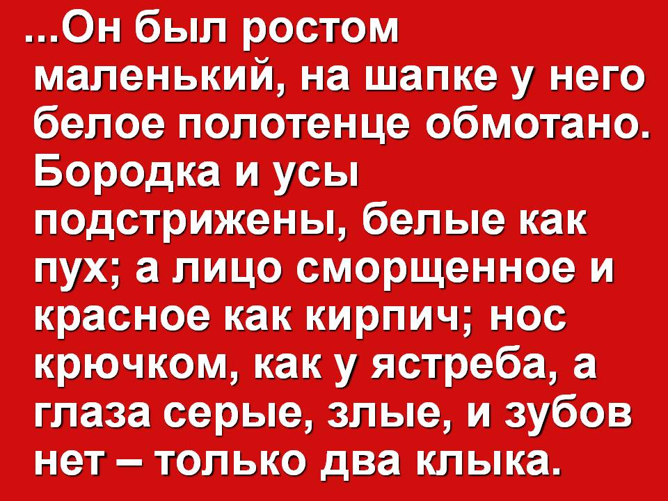 Красная. Он был ростом маленький, на шапке у него белое полотенце обмотано. Бородка и усы подстрижены, белые как пух; а лицо сморщенное и красное как кирпич; нос крючком, как у ястреба, а глаза серые, злые, и зубов нет – только два клыка. (Старик, проживающий уединённо, «…первый джигит был…»).