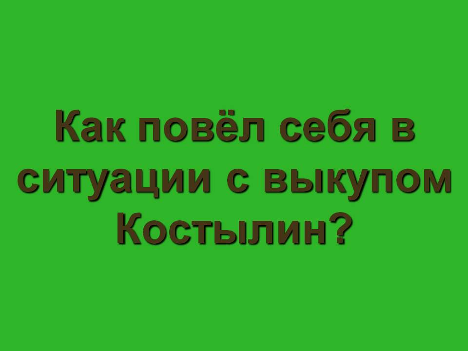 Зеленая дорожка. Как повёл себя в ситуации с выкупом Костылин? (Вскочил Абдул, показывает на Костылина, что-то говорит. Переводчик перевёл, что они теперь принадлежат оба одному хозяину, и кто прежде денег даст, того и отпустят.