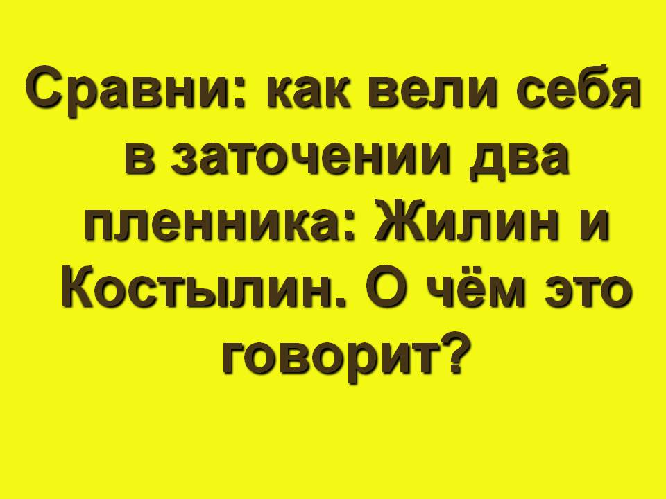 Жёлтая дорожка. Сравни: как вели себя в заточении два пленника: Жилин и Костылин. О чём это говорит? (Костылин ещё раз писал домой, всё ждал присылки денег и скучал. По целым дням сидел в сарае и считал дни, когда письмо придёт; или спал. Жилин ходил по аулу, высматривал, как ему бежать, а то сидит, что-нибудь рукодельничает – или из глины кукол лепит, или плетёт плетёнки из прутьев. Он на всякое рукоделье мастер был.)