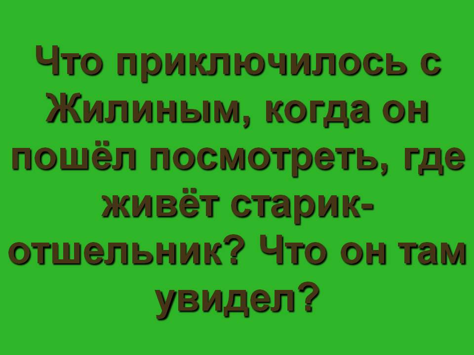 Зеленая дорожка. Что приключилось с Жилиным, когда он пошёл посмотреть, где живёт старик-отшельник? Что он там увидел? (Сошёл Жилин по дорожке, видит - садик, ограда каменная, из-за ограды черешни, шепталы и избушка с плоской крышей. Подошёл он поближе, видит - ульи стоят плетёные из соломы, и пчёлы летают, гудят. И старик стоит на коленочках, что-то хлопочет у улья. Поднялся Жилин повыше посмотреть и загремел колодкой. Старик оглянулся – как взвизгнет, выхватил из-за пояса пистолет, в Жилина выпалил. Чуть успел он за камень притулиться.)
